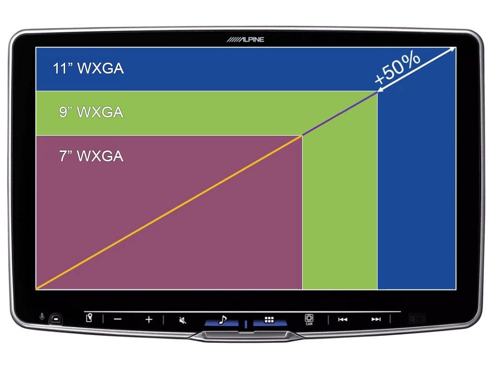 Alpine Halo 11 on 1280 x 720p (WXGA) resoluutiolla ja näytön pinta-ala on 49% suurempi kuin huippusuositussa Alpine Halo 9 soittimessa. Näytön kuvakkeet, valikot ja yksityiskohdat näkyvät siis entistä suurempina ja tarkempina. Näytön kulmaa pystyy säätämään ja soitin on mahdollista asentaa lähes mihin tahansa autoon, jossa on 1- tai 2-DIN paikka soittimelle.