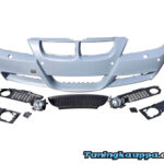 BMW E90 / E91 (vm. 2005 – 2008), laadukas M-Look etupuskuri. Soveltuu ajovalonpesureilla ja parkkitutkalla oleviin autoihin.