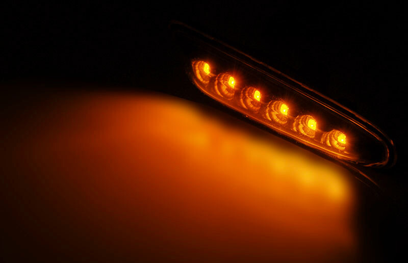 Näyttävät tummat LED sivuvilkut BMW -malleihin. Savunharmaa linssi ja kirkas LED-valo päivittävät auton ulkonäön modernimmaksi verrattuna alkuperäisiin sivuvilkkuihin.