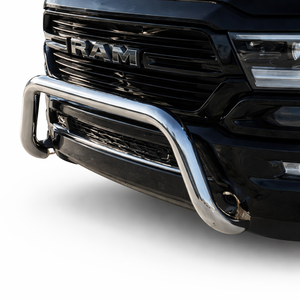 Näyttävä ja järeä valorauta Dodge RAM 1500 -malleihin (2019→). Tämä laadukkaasta ruostumattomasta teräksestä valmistettu valorauta tuo RAMin keulaan voimakkaan ja viimeistellyn ilmeen sekä tarjoaa käytännöllisen kiinnityspaikan lisävaloille.