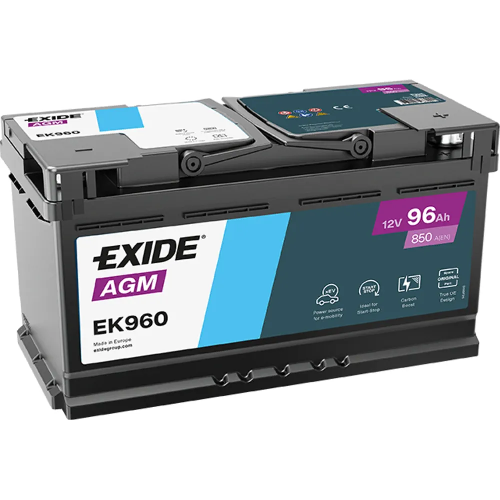Exide EK960 AGM on edistyksellinen 12V 96Ah käynnistysakku, joka on kehitetty erityisesti ajoneuvoihin, joissa on Start-Stop-järjestelmä, jarrutusenergian talteenotto sekä paljon sähköä kuluttavia lisävarusteita.