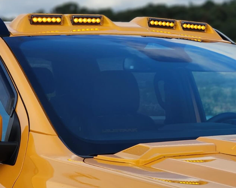 Laadukas muovista valmistettu moonvisor / valokotelo tuulilasin yläpuolelle katolle. Sisältää 4kpl valoja joissa oranssit ledit