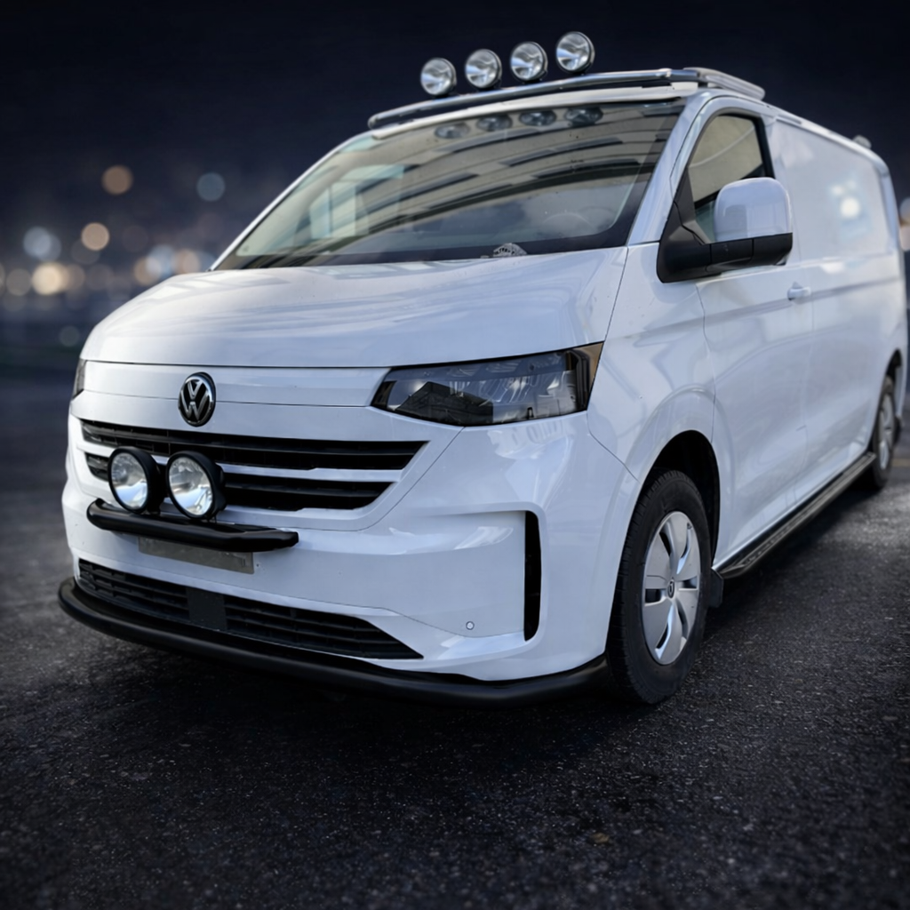 60 mm musta etupuskurin suojarauta Transit Custom ja Transporter T7 -malleihin. Sopii myös tutkien kanssa.