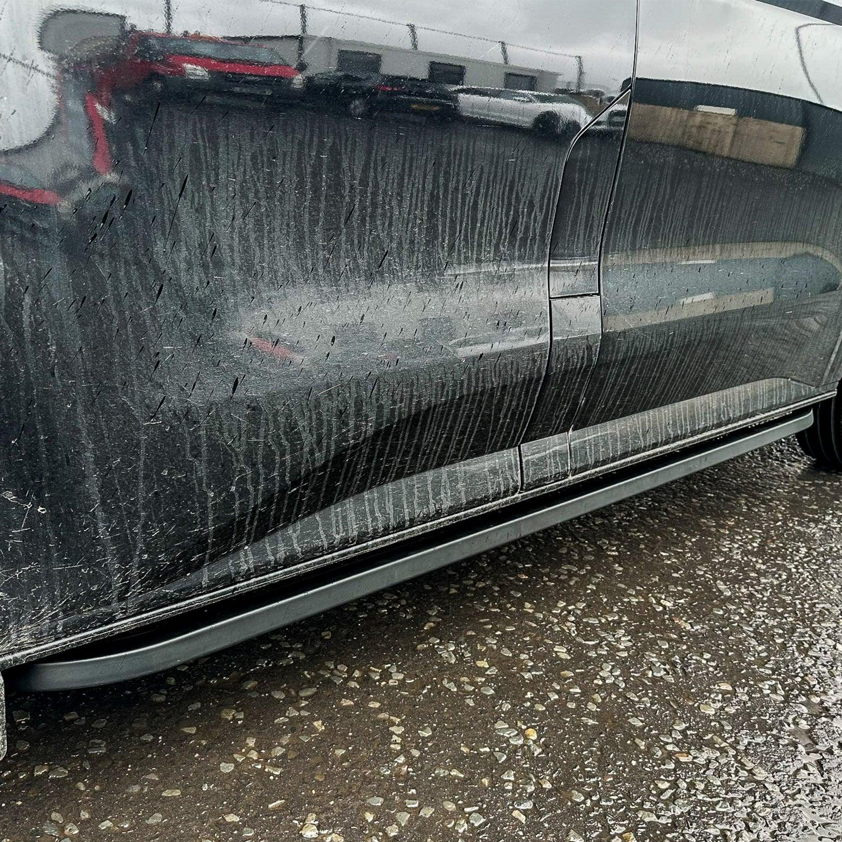 Ford Transit Custom / Vw Transporter T7 (2024->) mustat kanttiset Trapezoid kylkiputket (L2). Todella hieno uutuus Transporter T7:aan ja uuteen Transit Customiin!
