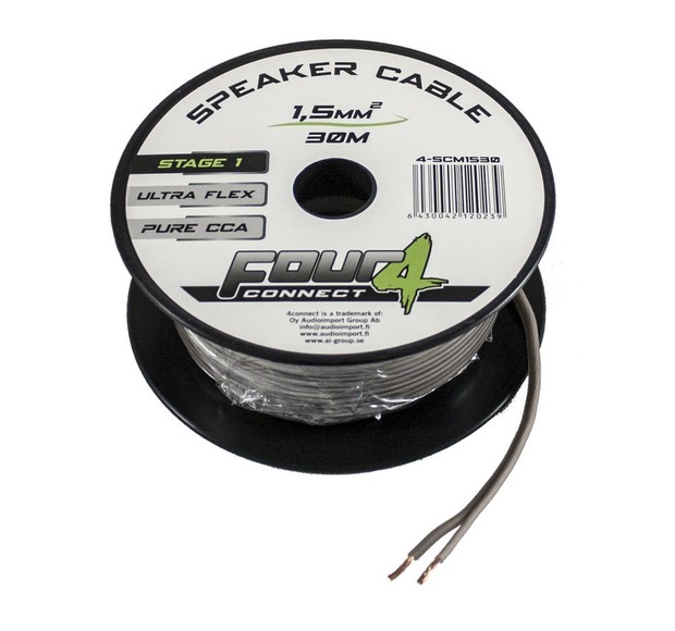 Kaiutinkaapeli 2×1,5mm2. OFCA-kaapelia. Pituus: 30 metriä. Erittäin notkea kaapeli