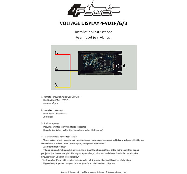 4Power jännitenäytöissä on herätekytkentä jonka ansiosta näyttö herää kun autoon laitetaan virrat päälle. Jännitteen kalibroinnin avulla saadaan mittarin näyttämä tarkemmaksi. Mittarikotelo on mahdollista uppoasentaa 26 x 45 mm aukkoon tai pinta-asentaa toimituksessa mukana tulevalla 3M 2-puoleisella tarralla.