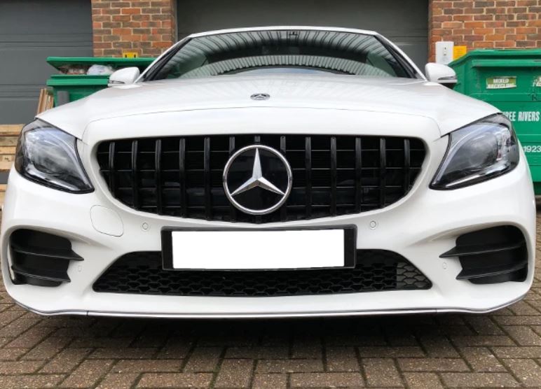 Erittäin näyttävä kokonaan kiiltävän musta GT-R -look AMG maski facelift -mallin W205:iin, vm. 2018 eteenpäin. Autoihin ilman etukameraa