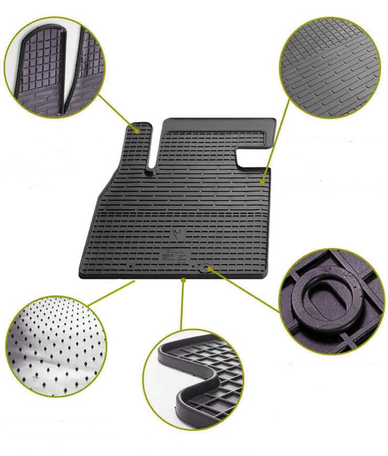 Matot valmistetaan testatusta, hajuttomasta ja ympäristöystävällisestä kumiseoksesta, joka täyttää tiukat eurooppalaiset laatuvaatimukset. Kestävä koostumus takaa joustavuuden, pitkän käyttöiän ja tehokkaan suojan auton sisätiloille.