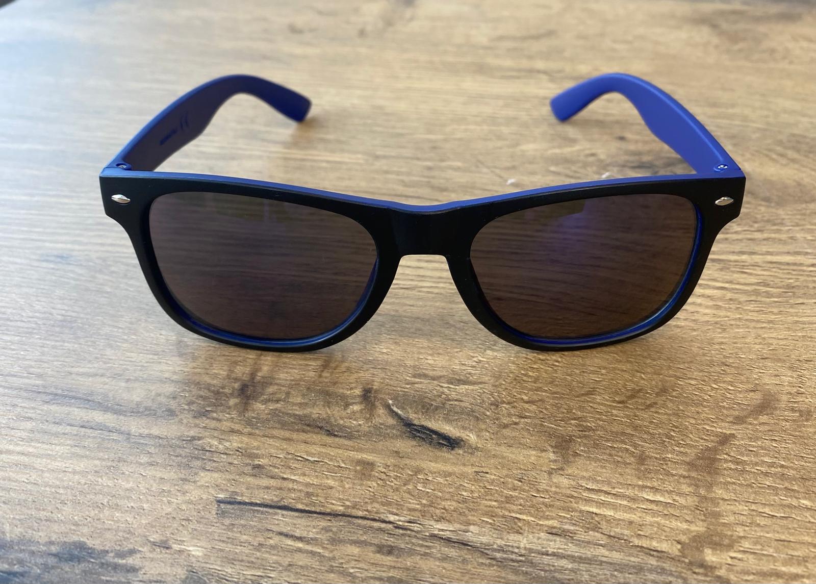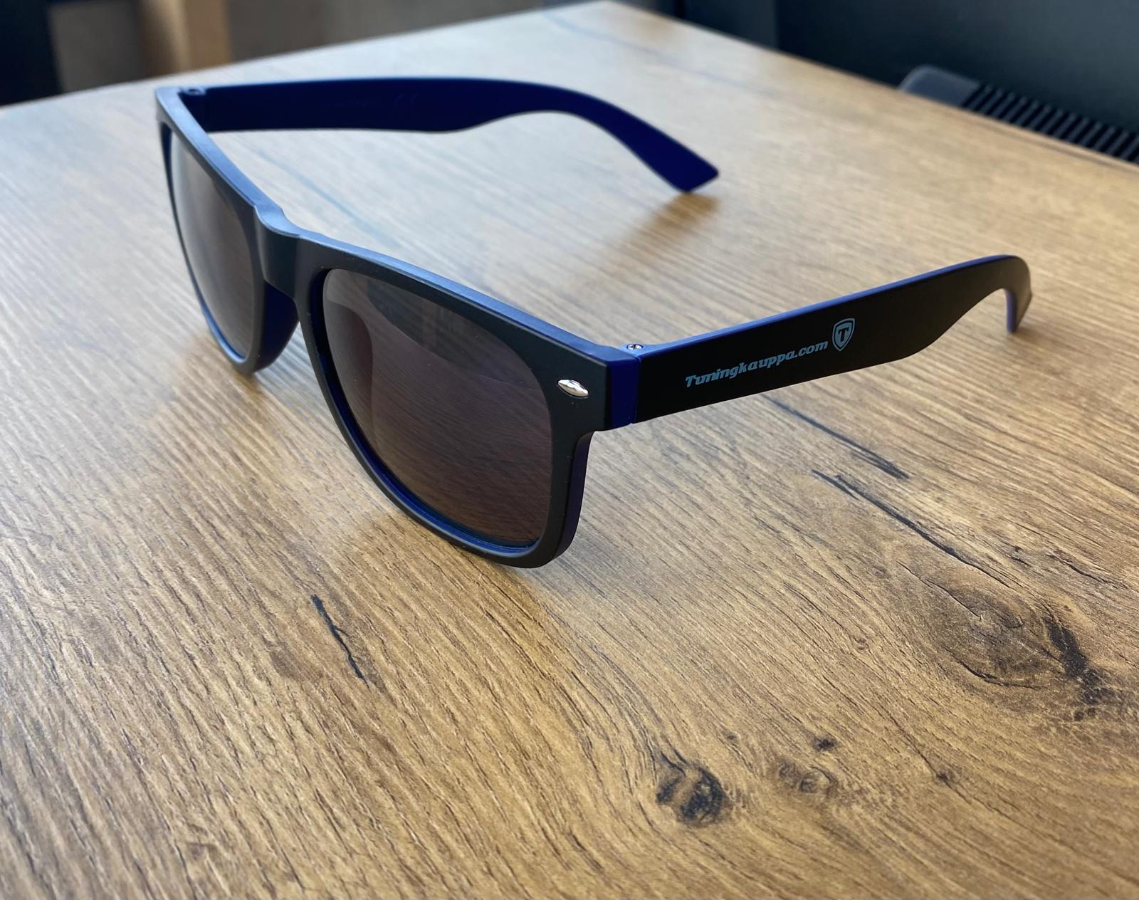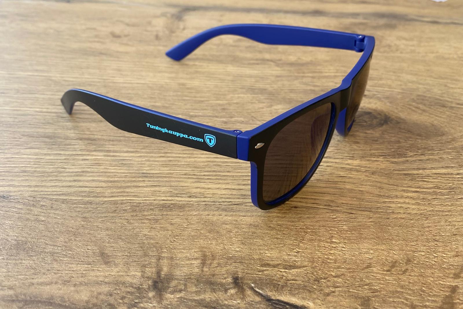 Näyttävät musta/siniset Tuningkauppa.com aurinkolasit, joissa logo molemmissa sangoissa.