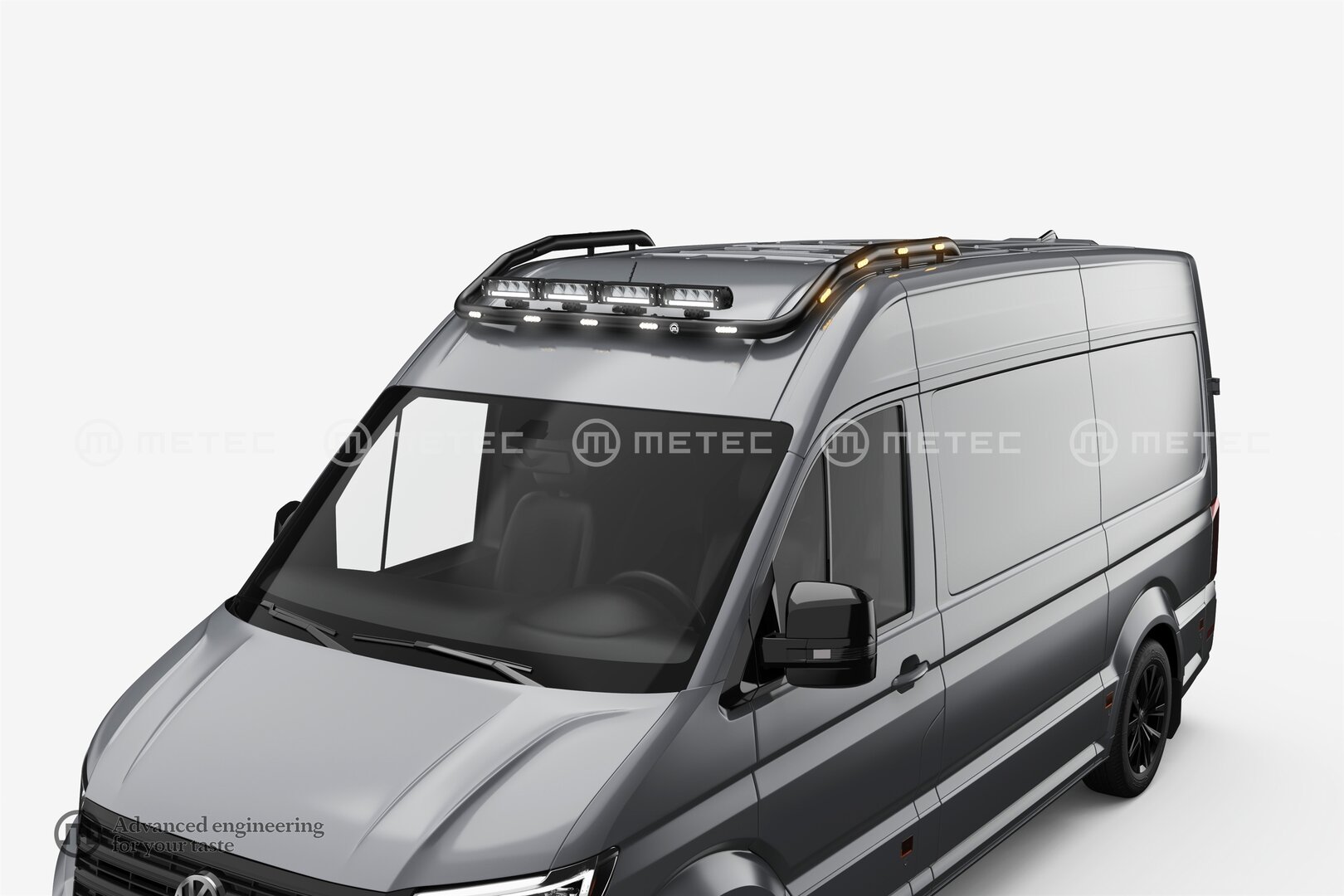 Metec musta kattorauta LED-äärivaloilla VW Crafter / MAN TGE 2017–> H2 -malleihin. Sisältää lisävalojen kiinnityskorvakkeet ja valmiit johdotukset.