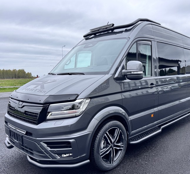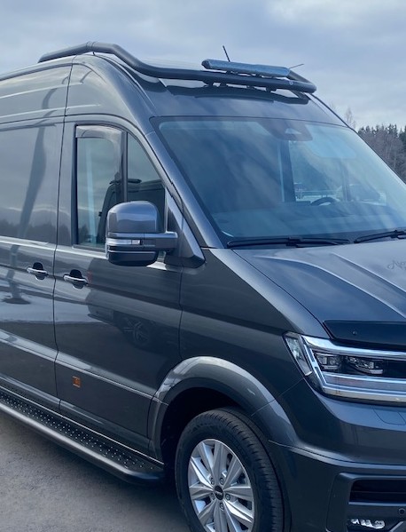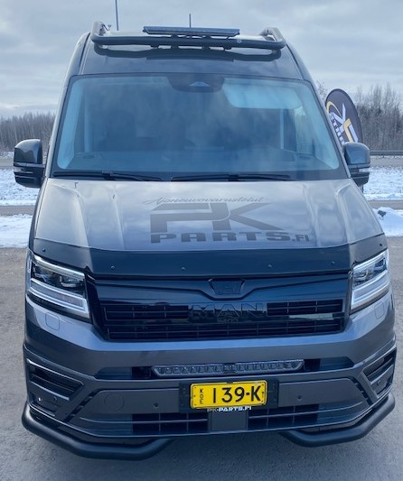 VW Crafter / MAN TGE 2017-> Musta valoteline tuulilasin yläpuolelle H2. Upea mustaksi pulverimaalattu eteen tuulilasin päälle asennettava valorauta vm. 2017 ja uudempiin korkea H2 kattoisiin Craftereihin ja MAN TGE -malleihin