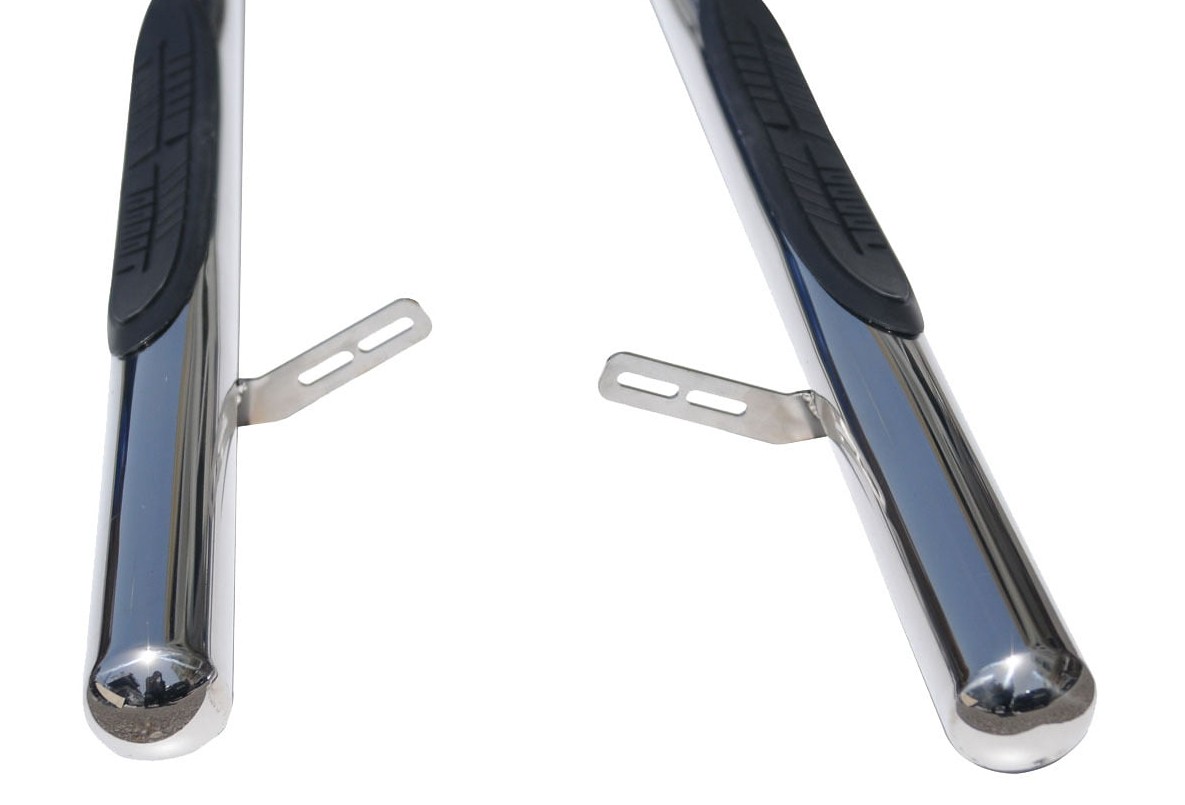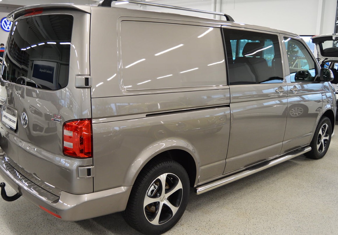 Laadukkaat ruostumattomasta teräksestä valmistetut RST-kylkiputket muoviaskelmilla VW Transporter T5, T6 ja T6.1 -malleihin. Sopii pitkälle L2-korimallille (3400 mm akseliväli). Sisältää mallikohtaiset kiinnikkeet.