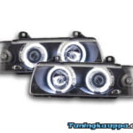 BMW E36 Sedan / Touring, vm. 1991-1998, laadukkaat Angel Eyes tummaoptiikka ajovalot. Polttimokanta: H1 + H1. Parihinta!